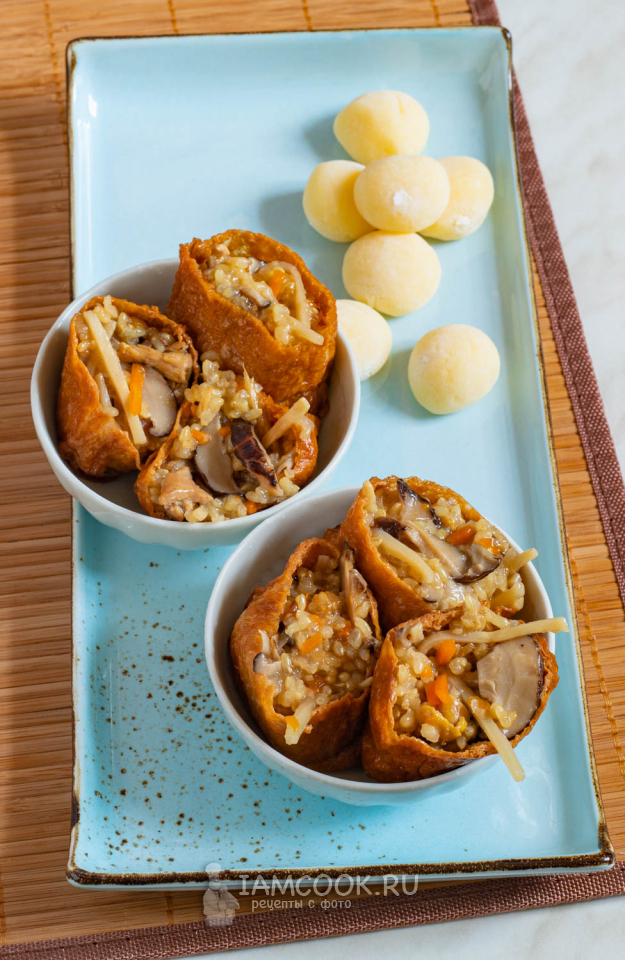 Инари суши (в Японии их ещё называют «детские суши») - это суши в тонкой оболочке из жареного тофу, вымоченной в мирине. Самостоятельно эту оболочку не сделать, её нужно покупать готовой. Но вот насчёт начинки - тут можно и расстараться! Самый элементарный и распространённый рецепт инари суши предусматривает наполнение конвертика из тофу... просто рисом. Вам такое есть (и готовить) интересно? Лично мне - нет. А вот инари суши с гомоку гоханом я просто обожаю. Тем более что в Европе в азиатских забегаловках такого не подают (они всё как раз просто с рисом делают, это же быстрее и дешевле). То, что вы не видели таких инари суши, как у меня, в своей ближайшей сушечной, не значит, что этот рецепт придумала я сама. Он - японский.