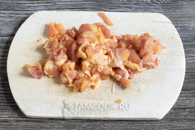 Курятину мелко рубим (кусочками 1-2 см). Но именно ножом рубим, а не на мясорубке.
