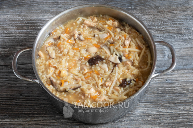 Наливаем в кастрюлю воду, растворяем в ней приправу (если у вас есть даши), вводим все ингредиенты, доводим до кипения, после чего увариваем гомоку гохан до консистенции ризотто (или жидкой рисовой каши, если кому-то такое определение ближе). По времени займёт не менее 20 минут с момента закипания.