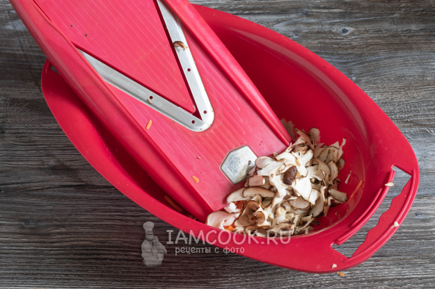 Грибы шиитаке режем тонкими пластинками.
