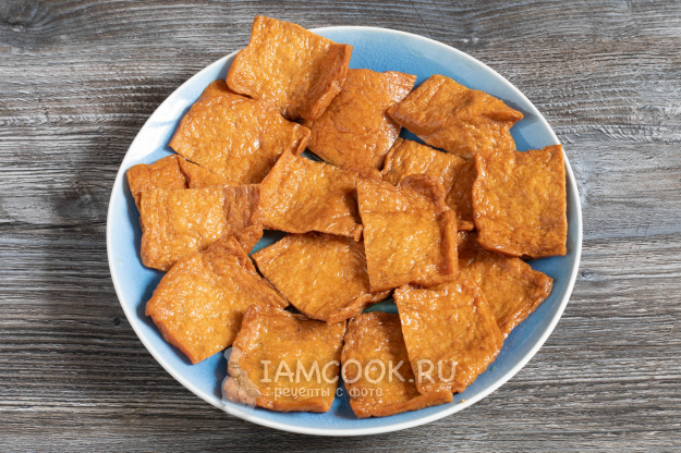 Пока варится гомоку гохан, извлекаем конвертики для инари суши из банки (чтобы извлечь заготовки, лучше перекувырнуть банку над большой тарелкой) и раскрываем их. Если вы видите эту диковинку впервые, то ищите ту сторону, которая разрезана. Это одна из длинных. Три стороны будут как бы заправленные, а у одной будет видна слоистая структура. Раскрывать конверт начинают с неё.