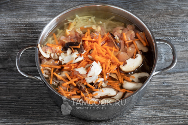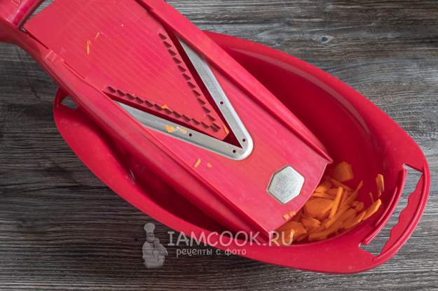 Режем морковь тонкой соломкой. Если у вас проростки бамбука в банке не соломкой (у них разная форма расфасовки бывает), то их тоже режем так же, как морковь.