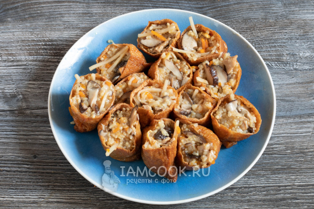 Фаршируем рисом с грибами, курятиной и бамбуком конвертики из тофу.