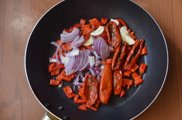 Добавить к перцу лук, чеснок, вяленые помидоры. По желанию помидоры можно нарезать тонкими полосками или оставить крупными кусочками. Обжаривать овощи до золотистого цвета 3-4 минуты.