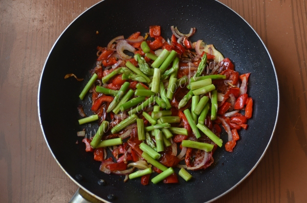 Добавить к овощам спаржу, нарезанную на 4-5 частей. Готовить еще 2-3 минуты.