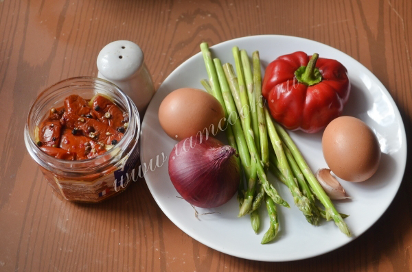 Яичница со спаржей и вялеными помидорами готова. Осталось подать к блюду кусочек свежего хлеба и заварить чай!