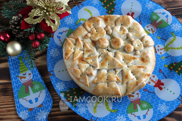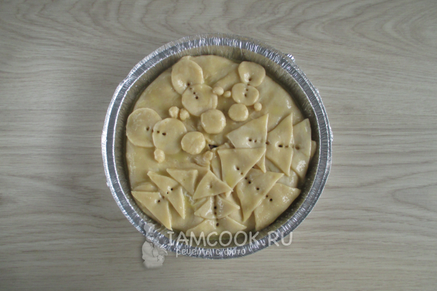 Из обрезков теста можно сформировать какое-нибудь украшение для поверхности пирога. Например, нарежьте небольшие треугольнички и кружочки, из них получатся "ёлочки" и "снеговички". Смажьте поверхность заготовки пирога смесью из желтка с водой. Вилкой сделайте проколы для выхода пара.