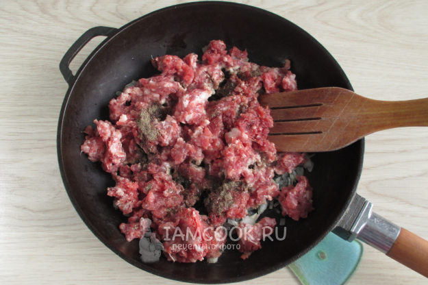 Отправьте на сковороду к луку фарш, посыпьте черным молотым перцем.