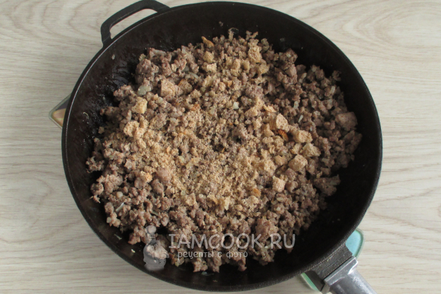 В готовый жареный фарш добавьте хлебные крошки (или крошку из сухарей, например, из черного хлеба) и измельченный мускатный орех по вкусу.