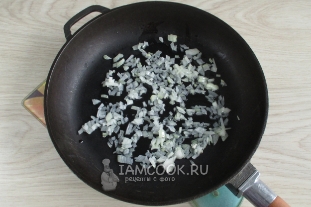 Для начинки нашинкуйте лук и обжарьте его на сковороде на растительном масле, слегка посолите.