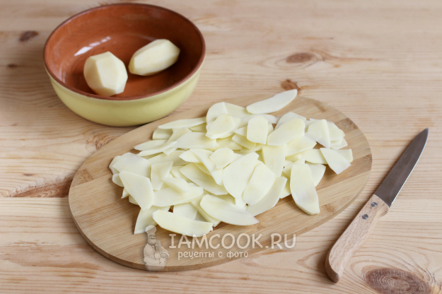 Картофель очистим от кожуры и нарежем тонкими пластинами. Так как рыба готовится быстро, нужно чтобы и картофель успел за это время дойти до готовности.