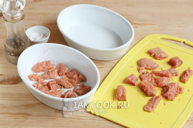 С горбуши срежем шкурку, удалим кости и нарежем кусочками на один укус. Формочки для выпечки немного смажем растительным маслом и разложим в них кусочки филе горбуши. Приправим рыбку солью и перцем.