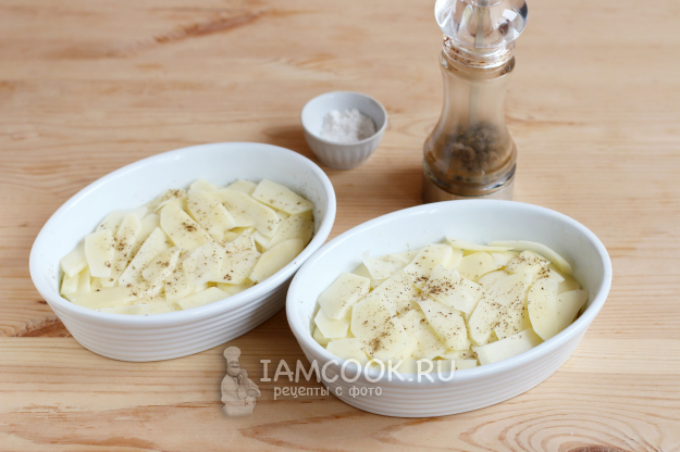 Раскладываем картофель поверх кусочков горбуши, добавим немного соли и молотого перца.
