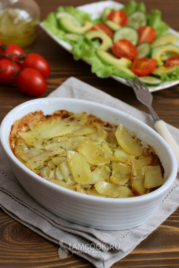 Очень вкусное, сочное и нежное блюдо получилось! Картофель полностью готов, он получается мягким благодаря тому, что нарезали мы его тонко, да и запекали в сливках. Приятного аппетита!