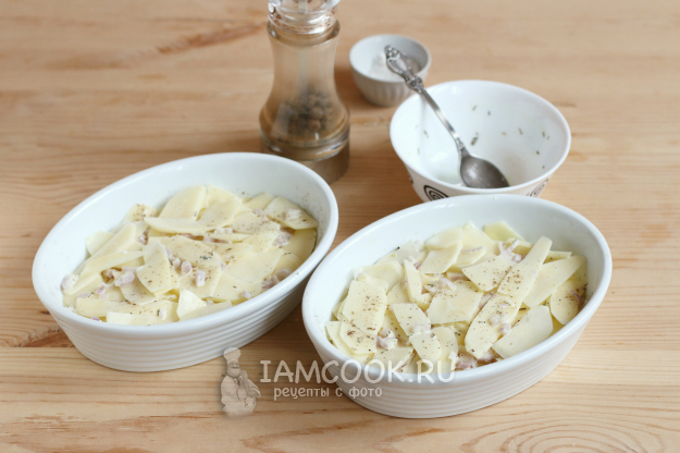 Заливаем картофель сливками со специями и луком, немного перемешаем. Ставим формы в разогретую до 180 градусов духовку и запекаем около 20-ти минут.