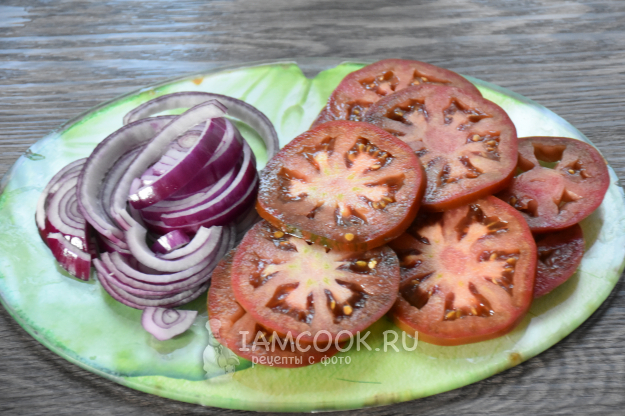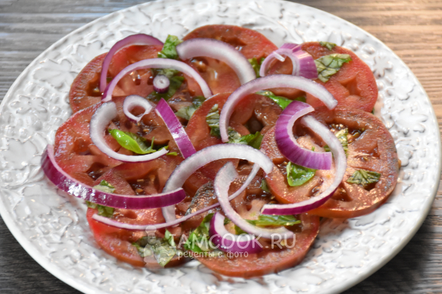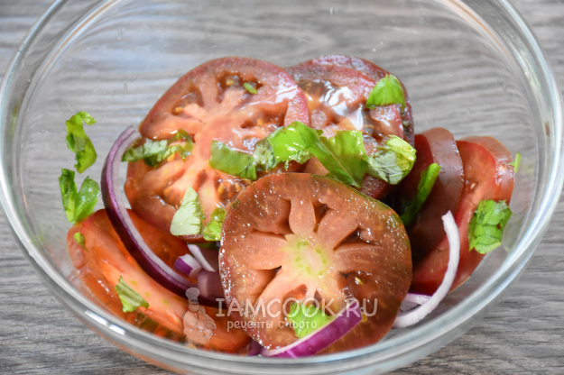 Сложить в миску помидоры, лук, листья базилика, сбрызнуть оливковым маслом, поперчить, посолить по вкусу и оставить на 10 минут.