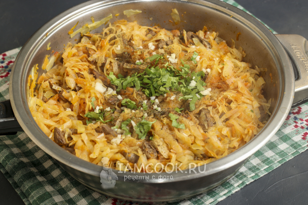 Затем открыть крышку, блюдо посолить и поперчить, добавить любимые специи, если желаете. Добавить в капусту измельчённые чеснок и петрушку, перемешать и готовить ещё пару минут. Снять с огня и дать настояться.