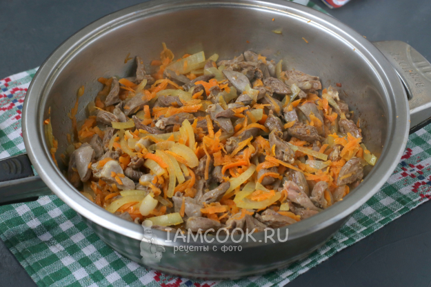 Растопить в сковороде сливочное масло, добавить к нему растительное. Добавить в сковороду лук с морковью, обжарить буквально пару минут и добавить куриные сердечки.