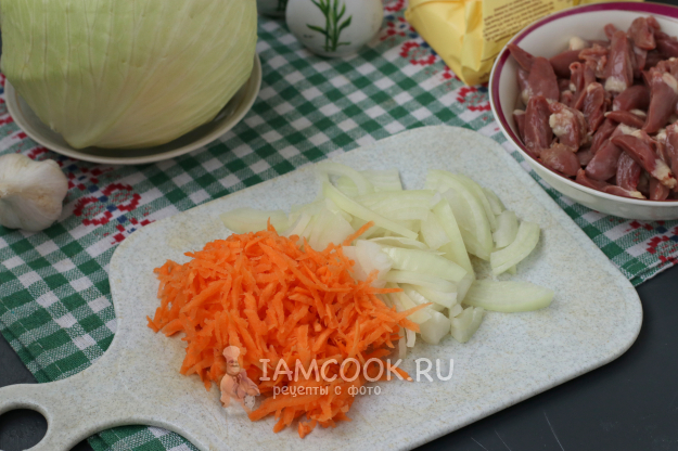 Для приготовления тушёной капусты с куриными сердечками подготовить из списка необходимые ингредиенты.