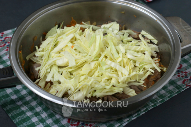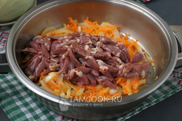 Пока сердечки жарятся, нашинковать капусту. Добавить её к сердечкам и обжаривать вместе ещё 10 минут.