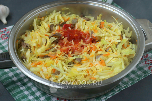Спустя это время в 150 мл воды разбавить томатную пасту, добавить её в капусту, перемешать и накрыть сковороду крышкой. Готовить 15-20 минут - до испарения жидкости.