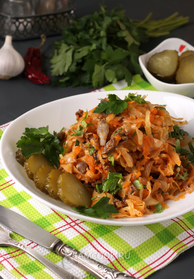 Невероятно вкусную тушёную капусту с куриными сердечками подать к столу. Дополнить можно свежими овощами или соленьями.