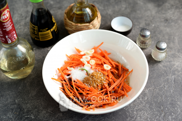 Добавьте уксус, соевый соус, постное масло. Всыпьте все специи и нарубленный чеснок. Соль я использую морскую, ее добавляю неполную чайную ложку, вы кладите по вкусу. Если любите вкус чеснока, тогда пропустите его через пресс. Перемешайте все тщательно.