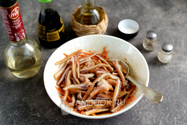 Уши нарежьте тонкой соломкой, всыпьте в миску, перемешайте и оставьте мариноваться часа на три.