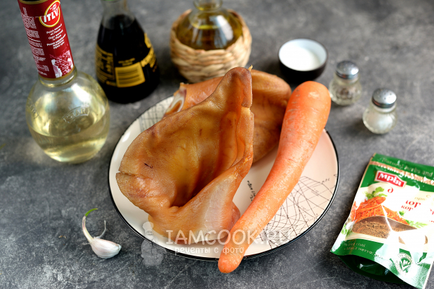 Подготовьте все необходимые продукты для приготовления копченых свиных ушей по-корейски. Каждое ухо наколите на вилку, осмолите над газовой конфоркой от остатков ворса, зачистите ножом. Помойте уши под проточной водой, обсушите бумажными полотенцами.