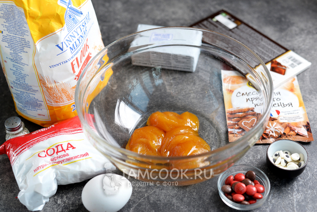 Подготовьте все необходимые продукты для приготовления пряного печенья «Олени Санты». Смесь для пряного печенья можно заменить на 0,5 ч.л. молотого имбиря, корицы и кардамона, и уверяю вас, получается ничуть не хуже. M&Ms можно взять красные и шоколадные, ведь красный нос только у самого главного оленя Санты.