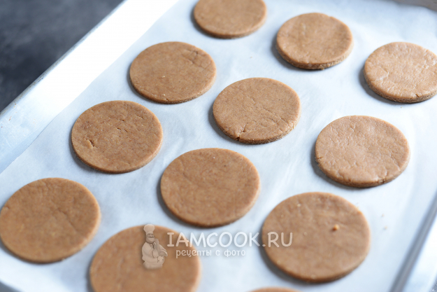 Разделите тесто на две части, раскатайте его на пекарской бумаге, вырежьте круглые заготовки. Я это сделала с помощью малого сервировочного кольца. Отправьте противень в предварительно разогретую до 190 градусов духовку на 8-10 минут. Следите: оно должно чуть пожелтеть, тогда будет мягким.