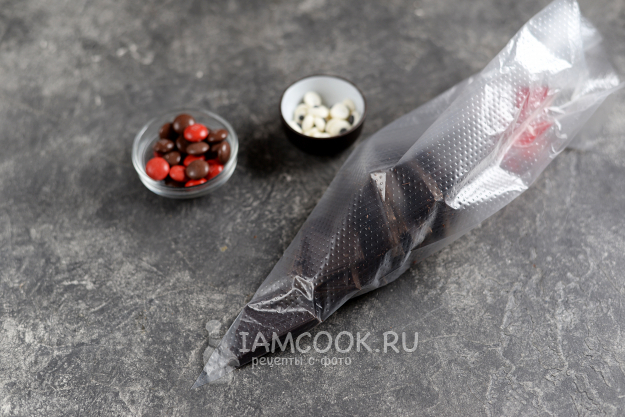 Пока подготовьте все необходимое для декора. Шоколад поломайте, переложите в кондитерский мешок, положите в микроволновку на 1 минуту. Глаза я делаю из айсинга, но можно их заменить на коричневый m&ms.