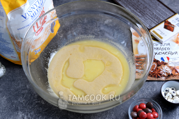 Дальше влейте растопленное сливочное масло, смешайте все до однородного состояния.