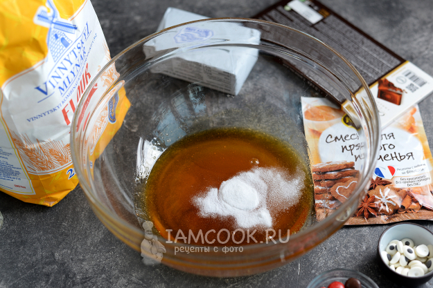 Интенсивными движениями начните перемешивать мед с содой, масса должна полностью побелеть.