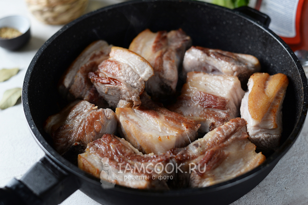 Ребра нарежьте порционно по косточке, обжарьте на сковороде до румяной корочки. Если ребра с сальной прослойкой, тогда они отлично будут жариться в собственном жиру, в противном случае нужно будет влить чуть постного рафинированного масла.
