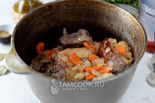 Овощи также переложите в казан. Влейте овощной бульон, добавьте воду, она должна слегка покрывать ребра с овощами. Тушите на тихом огне минут 40-50.