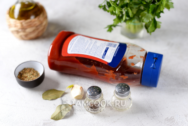 Теперь жаркое осталось посолить и поперчить по вкусу, положить в него раздавленный зубчик чеснока, лавровый лист и любимый томатный соус. Тушите на тихом огне еще минут 5.