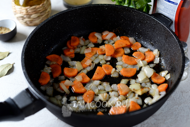 Переложите обжаренные свиные ребрышки в казан, а в этой же сковороде обжарьте нарезанные репчатый лук и морковь.