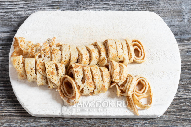 Даём блинам полностью остыть, сворачиваем трубочкой и режем соломкой.