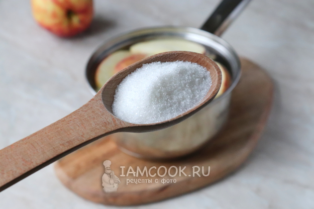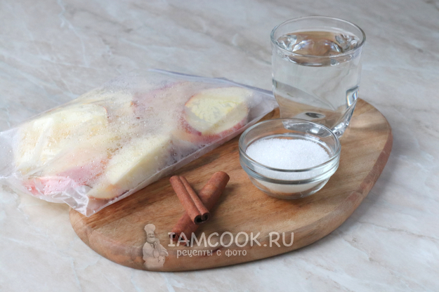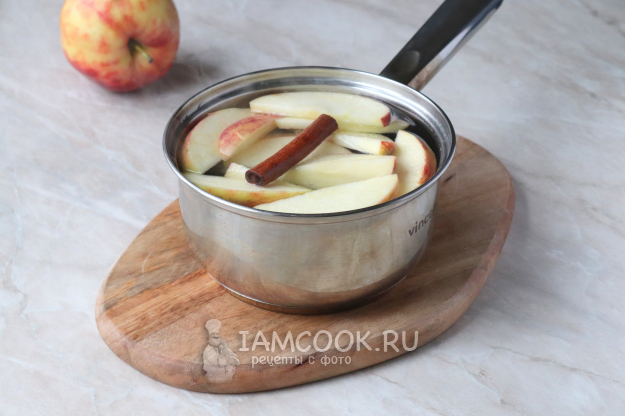 Воду налить в небольшой сотейник и довести до кипения. После чего выложить в варочную ёмкость дольки замороженных яблок и палочку корицы.
