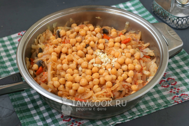 С отваренного нута слить воду. Измельчить чеснок. Если в сковороде не осталось жидкости, можно добавлять нут и чеснок. Если жидкость ещё осталась, то усилить огонь, чтобы лишняя влага испарилась. Затем всё содержимое хорошо перемешать, накрыть сковороду крышкой и дать настояться.