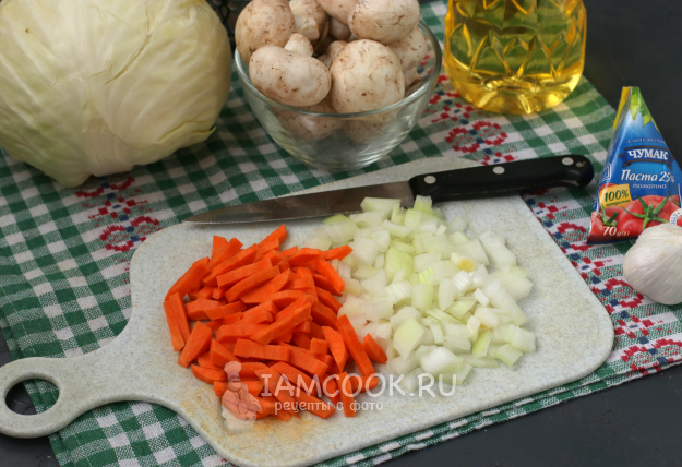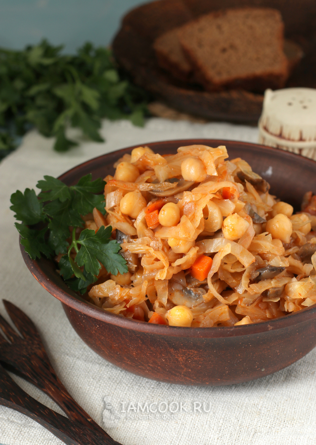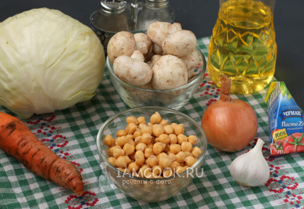 Для приготовления тушеной капусты с нутом и грибами подготовить из списка необходимые ингредиенты. Нут я сразу поставила варить, после того, как он уже набух за ночь.