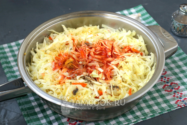Томатную пасту разбавить водой и добавить в капусту. Блюдо посолить и поперчить, добавить карри и другие приправы по желанию. Всё хорошо перемешать. Сковороду накрыть крышкой и готовить капусту 15 минут.