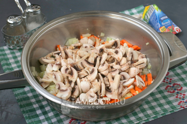 В сковороде разогреть растительное масло, обжарить лук с морковью до прозрачности лука. Затем добавить в сковороду шампиньоны и готовить до выпаривания жидкости.