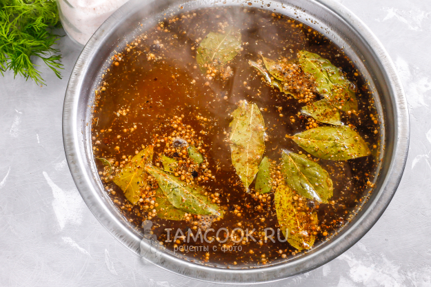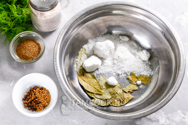 Сначала создайте рассол. Высыпьте в глубокую емкость соль и лавровые листья. Делать это можно сразу в кастрюле или ковше.
