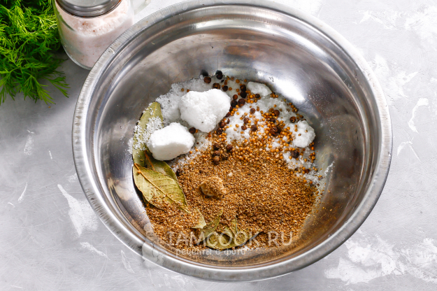 Всыпьте горошины черного перца, горчицу, молотый кориандр.