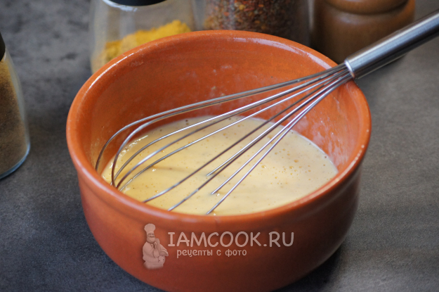 Для начала вбейте яйца в миску, добавьте сметану, соль и перец, перемешайте.