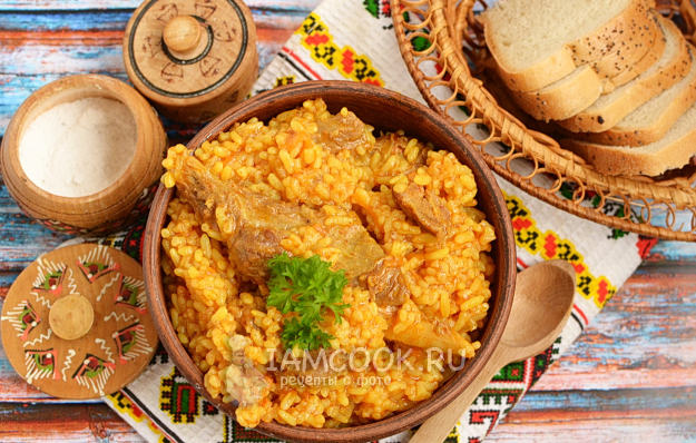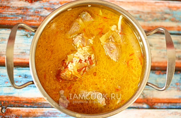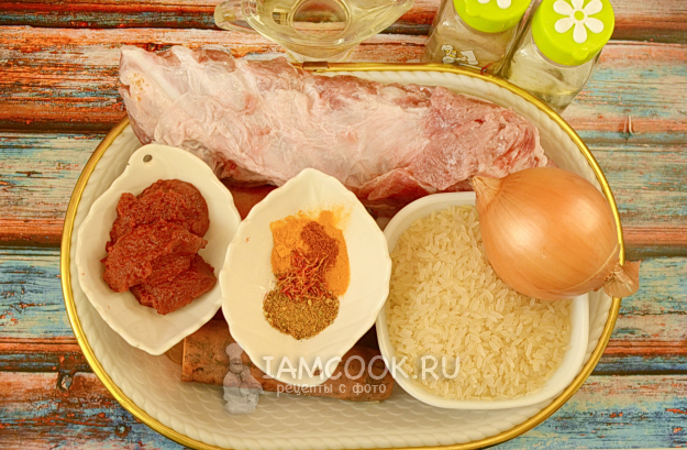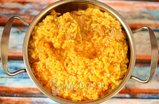 Когда мясо станет достаточно мягким, в кастрюлю со свининой добавим поджаренные лук и морковь, рис, томатную пасту и специи. Воды должно быть примерно в два раза больше, чем содержимого кастрюли.