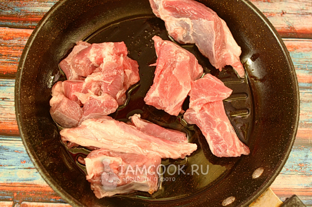 Выложим кусочки на сковороду с подсолнечным маслом (используем половину), поставим на огонь.