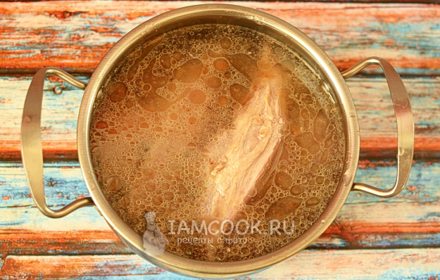Обжаренные кусочки мяса сложим в кастрюлю (лучше казанок), зальем водой, посолим и поставим тушиться. Тушим до мягкости. Время будет различным в зависимости от мяса. Я тушила немногим больше часа. Если мясо молодое, то отдельно его можно не тушить, а сразу добавлять рис и другие ингредиенты.